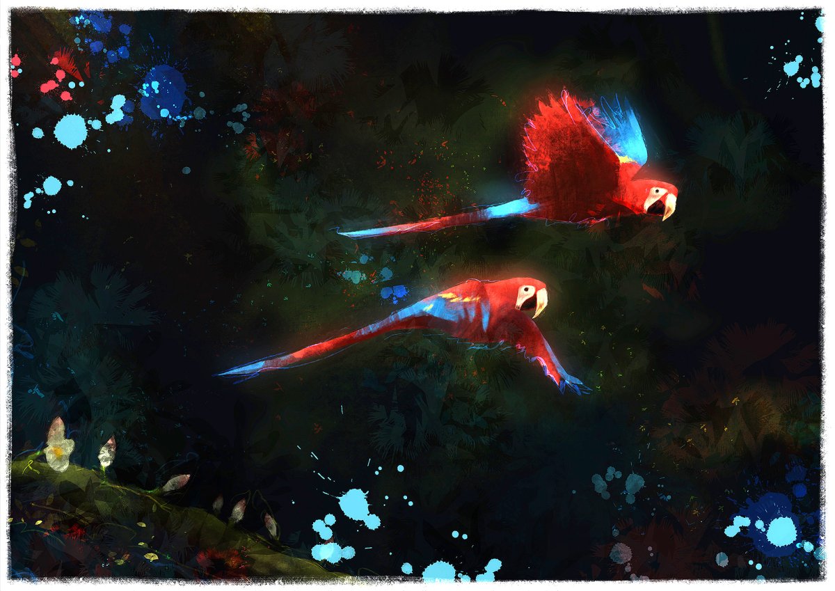 Mon inspiration provient du silence profond, presque sacré, de la canopée dense, soudainement rompu par le vol incandescent de l'Ara rouge. Je souhaitais explorer la frontière entre l'oiseau physique et son essence spirituelle, là où les plumes deviennent des traits d'énergie sur un vide vert impénétrable.